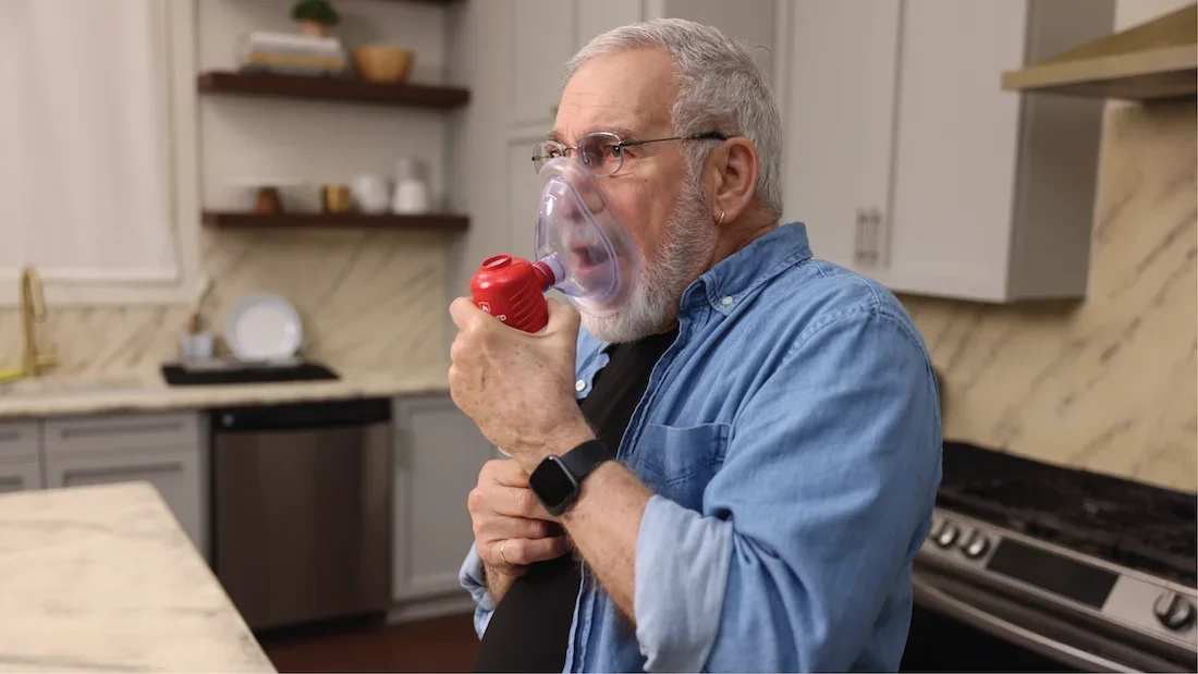 Dad removed it from its case, placed the mask over his face, and then started pumping the handle to create suction.